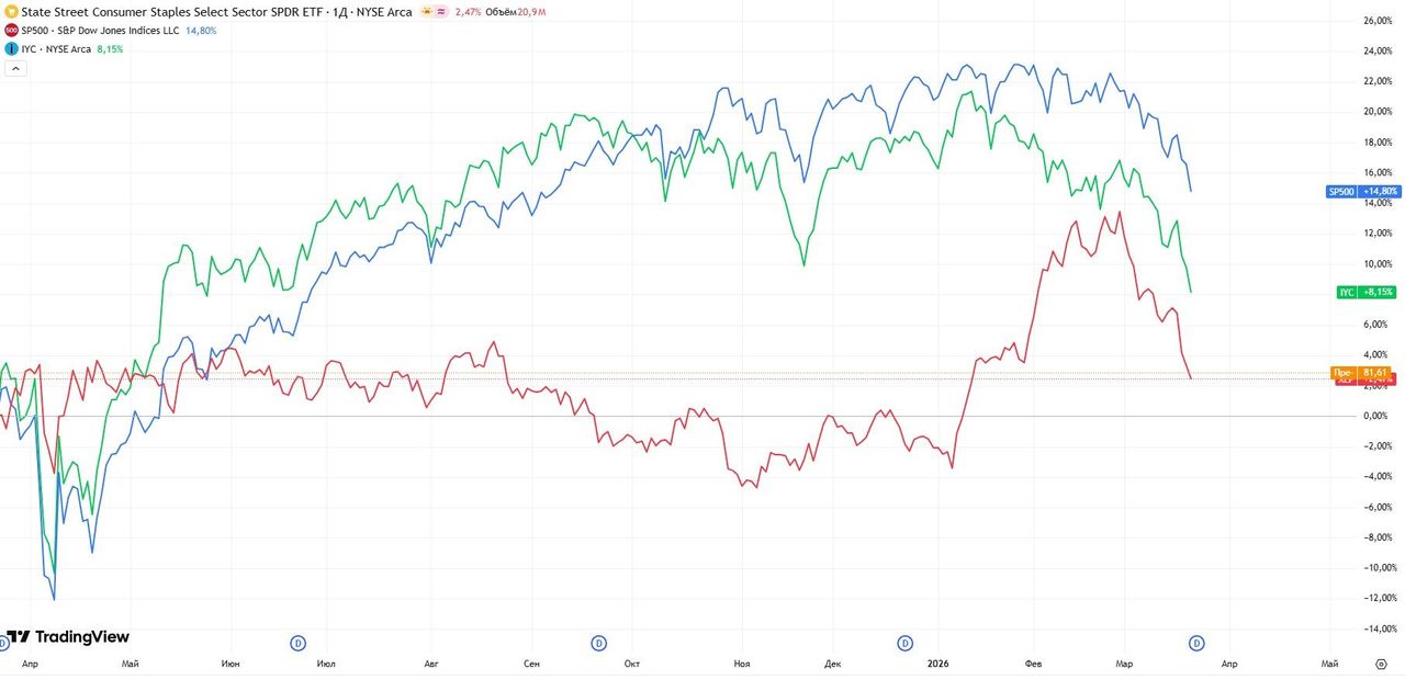 Динамика индексных фондов широкого рынка (SPY), компаний первичного (XLP) и дискреционного спроса (IYC) за последние 12 месяцев