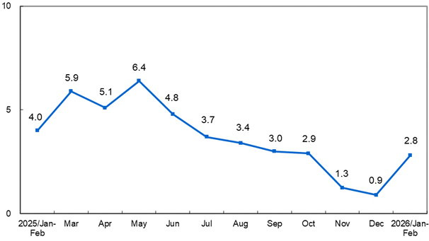 Розничные продажи товаров и услуг в январе-феврале выросли на 2,8% (г/г), что почти вдвое превышает темпы декабря (+1,9 п.п. динамики). В структуре продаж особенно выделяются категории одежда и текстиль (+10,4%), продукты и масла (+10,2%), коммуникационное оборудование (+17,8%), ювелирные изделия (+13%). Розничные продажи услуг выросли на 5,6% (г/г), что лучше прошлого года; сегменты общественного питания и онлайн-сервисов также находятся в числе лидеров (+4,8% и +7,3% соответственно). Онлайн-торговля продолжает усиливаться: розничные продажи товаров онлайн увеличились на 10,3%, а их доля в общем обороте превысила 24%.