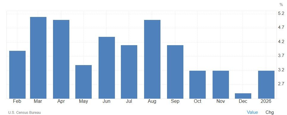 В январе 2026 года потребительские расходы в США увеличились на 0,4% (м/м) (реальные расходы +0,1% (м/м)), продолжается слабый, но позитивный тренд после аналогичного прироста в декабре. Основной вклад в динамику вносит рост цен — прежде всего на энергоносители, товары длительного пользования, жилье и услуги. Траты на неотъемлемые категории стабильны, а по большинству дискреционных сегментов сохраняется осторожность: после праздников сохраняется негативная динамика по готовности американских потребителей к крупным покупкам, путешествиям и развлечениям. При этом наблюдается локальный рост спроса в сегменте DIY.