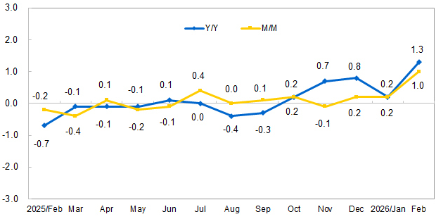 Индекс потребительских цен (CPI) за январь-февраль вырос на 0,8% (г/г) в январе–феврале (с ускорением до 1,3% в феврале), при этом ядро инфляции (не учитывает рост цен на еду и энергию) — +1,3% (г/г), что указывает на ослабление дефляционного давления. Цены на продукты питания и предметы первой необходимости растут быстрее инфляции. Показатели цен производителей (PPI) по-прежнему в отрицательной зоне, но темпы снижения замедляются.