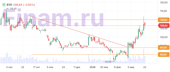 В числе фаворитов сектора выделяем BYD, который получил новый импульс на фоне роста цен на бензин и инноваций в электрификации. В марте 2026 года акции BYD продемонстрировали уверенный рост, на фоне ажиотажа в секторе новых энергетических автомобилей (NEV) из-за резкого подорожания топлива в Китае. В то время как китайский рынок акций в целом переживал распродажу, бумаги BYD в Шэньчжэне выросли до максимальных значений с октября 2025 года.