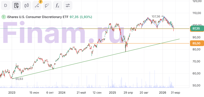 2. На фондовом рынке США на фоне конфликта с Ираном наблюдается волатильность: основные индексы скорректировались на 6-10% от максимумов, и, на наш взгляд, просадку в ряде бумаг потребительского сектора стоит откупать. В фокусе ― диверсифицированный фонд компаний дискреционного потребительского спроса (IYC ETF) и недооцененная бумага лидера ИИ-трансформации Amazon.