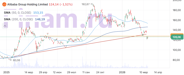 Мы видим потенциал в акциях Alibaba, несмотря на слабую квартальную отчетность. За три месяца, завершившихся в декабре 2025 года, выручка компании выросла всего на 2% (г/г) (до RMB 284,8 млрд), скорректированная EBITDA снизилась на 45% (г/г), а скорректированная чистая прибыль упала на 67% (г/г) — основные причины в активных инвестициях в искусственный интеллект, увеличенных маркетинговых расходах и завершении ряда непрофильных активов. Свободный денежный поток снизился на 71% (г/г).