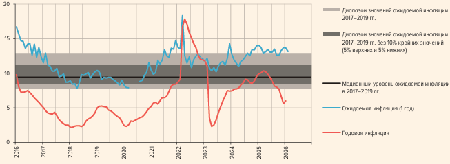 В начале 2026 года инфляция в России ускорилась из-за переноса повышения НДС, акцизов и других налогов в цены: в январе рост цен составил 1,6% (м/м) (14,6% в годовом выражении, SAAR), а годовая инфляция выросла до 6,0%. Однако этот всплеск оказался временным, и уже в феврале недельная динамика цен вернулась к траектории, соответствующей 4% годовых. Основная часть роста объяснялась разовыми факторами предложения и сезонностью (повышение тарифов, удорожание плодоовощной продукции), а устойчивое инфляционное давление, по оценкам ЦБ, не усилилось. Влияние январского скачка цен оказалось относительно небольшим, вторичных инфляционных эффектов не наблюдается. Инфляционные ожидания населения и бизнеса также снизились после локального максимума.
