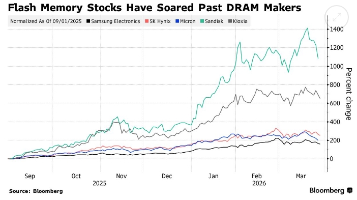 Инвесторы раньше активно приобретали продукты для флэш-памяти и хранения данных, ожидая роста спроса по мере распространения ИИ. Акции компаний, таких как Sandisk Corp. и Kioxia, значительно выросли. Например, акции Sandisk с конца августа увеличились более чем на 1000%, а акции Kioxia — на 600%. Это позволило им обогнать лидеров сектора памяти, таких как Samsung, SK Hynix и Micron, которые изначально считались фаворитами в области ИИ.