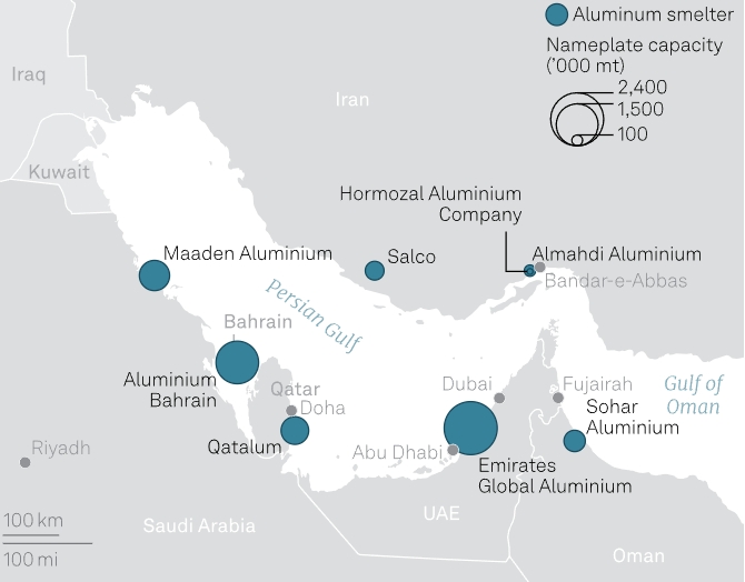 В регионе Персидского залива расположены одни из крупнейших и наиболее технологически продвинутых алюминиевых заводов в мире, в том числе EGA в ОАЭ, Alba, Ma’aden Aluminium в Саудовской Аравии, Qatalum в Катаре и Sohar Aluminium в Омане.