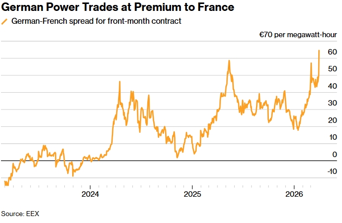 По данным EEX, во вторник немецкие контракты на майскую поставку электроэнергии торговались по цене 86,80 евро за мегаватт-час, в то время как во Франции этот показатель составлял 22,06 евро за мегаватт-час.