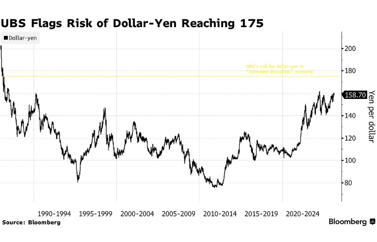 Стратеги UBS Group AG считают, что иена продолжит падение, несмотря на ужесточение интервенционистской политики японских властей. В сценарии «длительных потрясений» они прогнозируют, что к концу года курс пары доллар-иена достигнет 175.