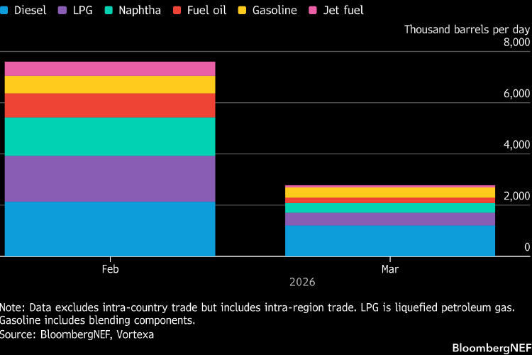 По итогам марта экспорт нефтепродуктов с Ближнего Востока рухнул на 4,8 млн баррелей в день относительно довоенных уровней. Средний показатель составил в прошлом месяце 2,8 млн б/д, подсчитали аналитики BloombergNEF на основе данных Vortexa.