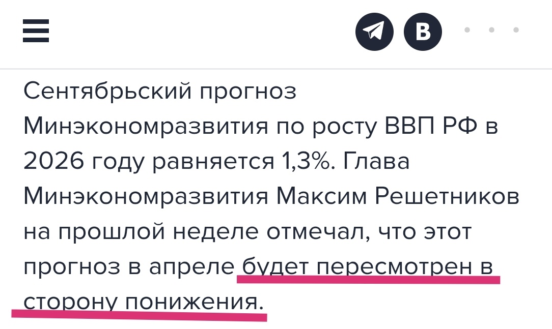 Минэкономразвития тоже себе не может это представить. Поэтому глава ведомства Решетников уже заявил, что прогноз на 2026 год скоро будет пересмотрен, естественно в сторону понижения.