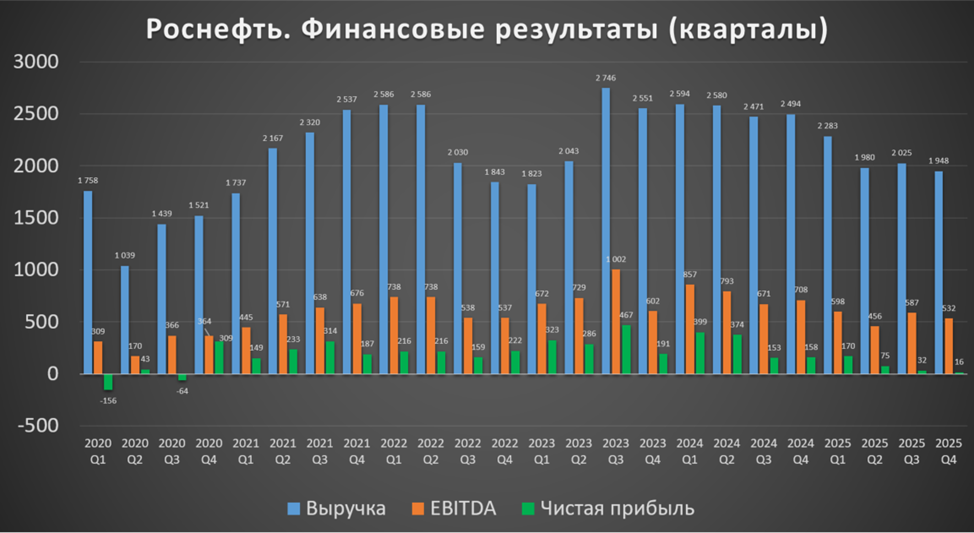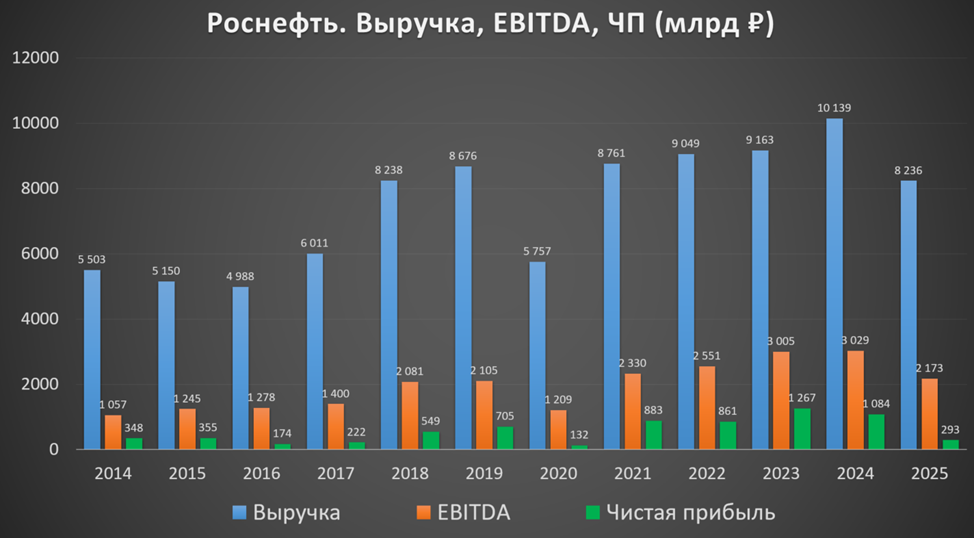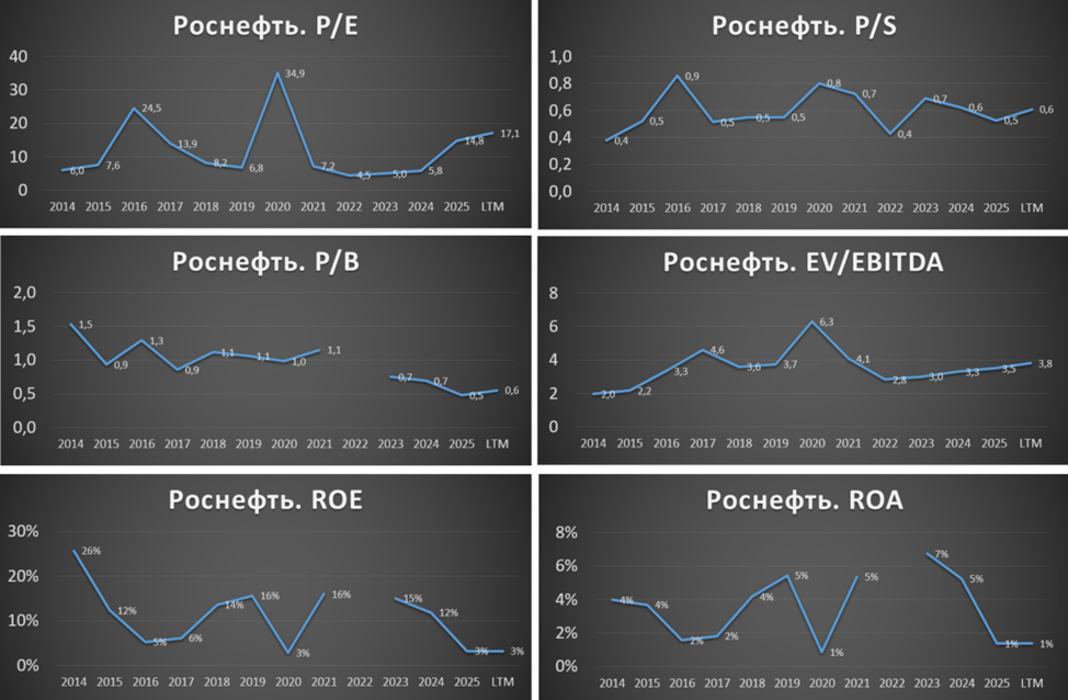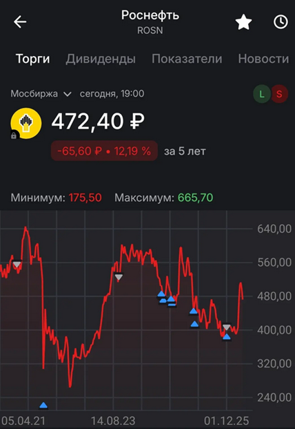 За 2025 года акции Роснефти снизились почти на треть, не считая выплаченных дивидендов. Текущие котировки соответствуют средним значениям за 7 лет.