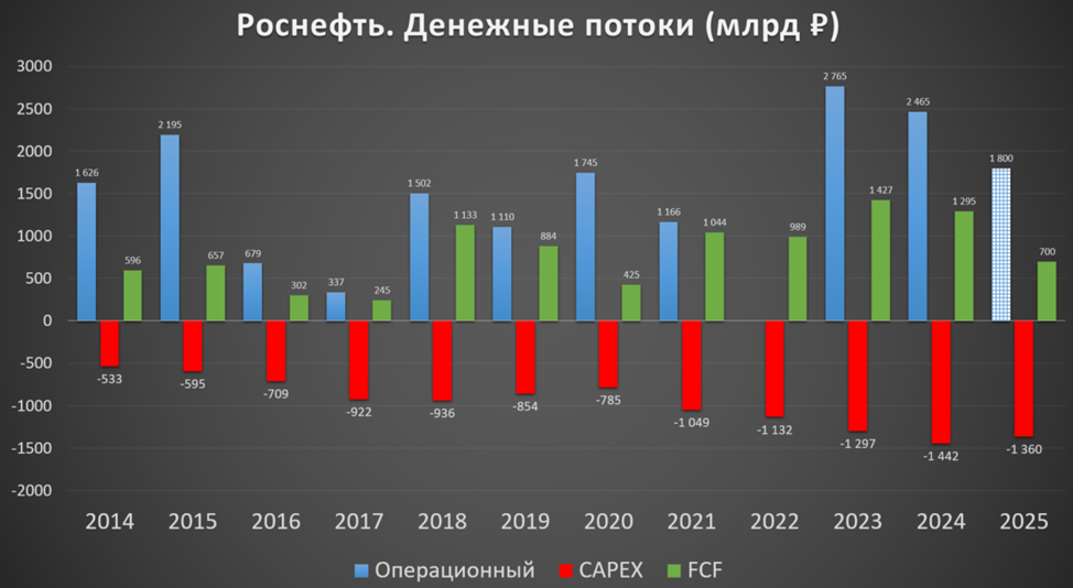 Таким образом, FCF 2025 самый низкий за последние 5 лет. Но с другой стороны, он соответствует средним значениям за последние 15 лет.