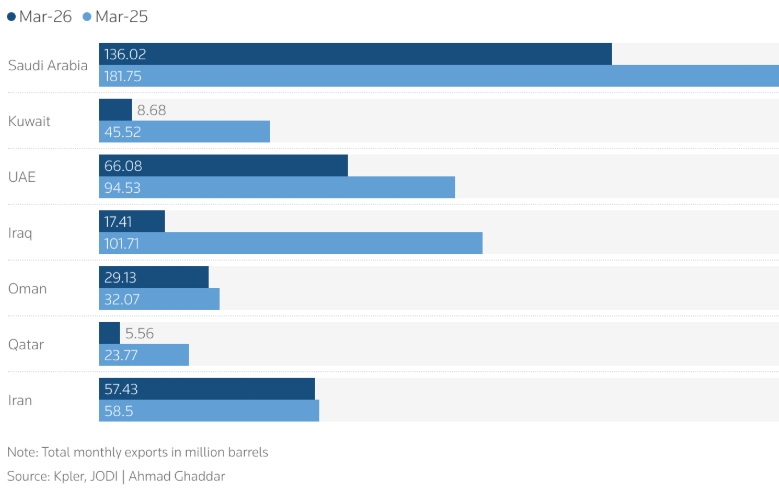 Экспорт сырой нефти и конденсата из большинства стран Персидского залива сократился, поскольку война США и Израиля с Ираном фактически перекрыла Ормузский пролив