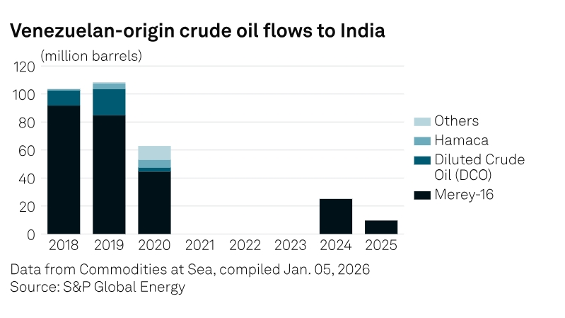 В 2019 году Индия импортировала около 300 000 баррелей венесуэльской нефти в день, но с тех пор объемы поставок резко сократились, составив около 25 миллионов баррелей в 2024 году. В 2025 году пять сверхбольших танкеров (VLCC) — по одному в месяц — осуществляли разгрузку венесуэльской нефти в порту Сикка, последняя разгрузка состоялась в мае.