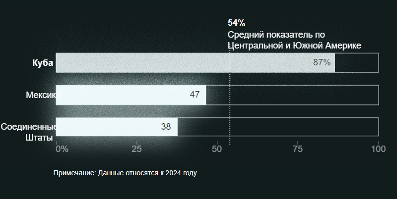 Куба находится в более сложном положении, чем ее соседи Ямайка и Доминиканская Республика, которым на протяжении последних нескольких десятилетий удавалось компенсировать свои потребности в нефти за счет угля, природного газа и возобновляемых источников энергии, в то время как Куба не смогла этого сделать в условиях длительного торгового эмбарго США.
