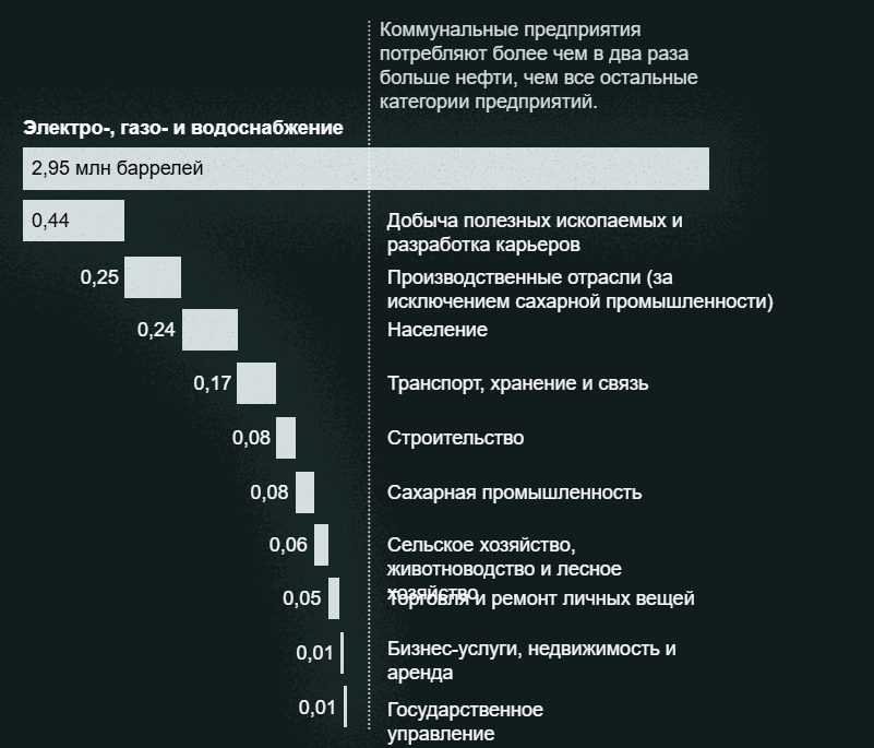 Использование нефти на Кубе по видам деятельности. Данные в баррелях нефти, усредненные за период 2019–2023 годов.