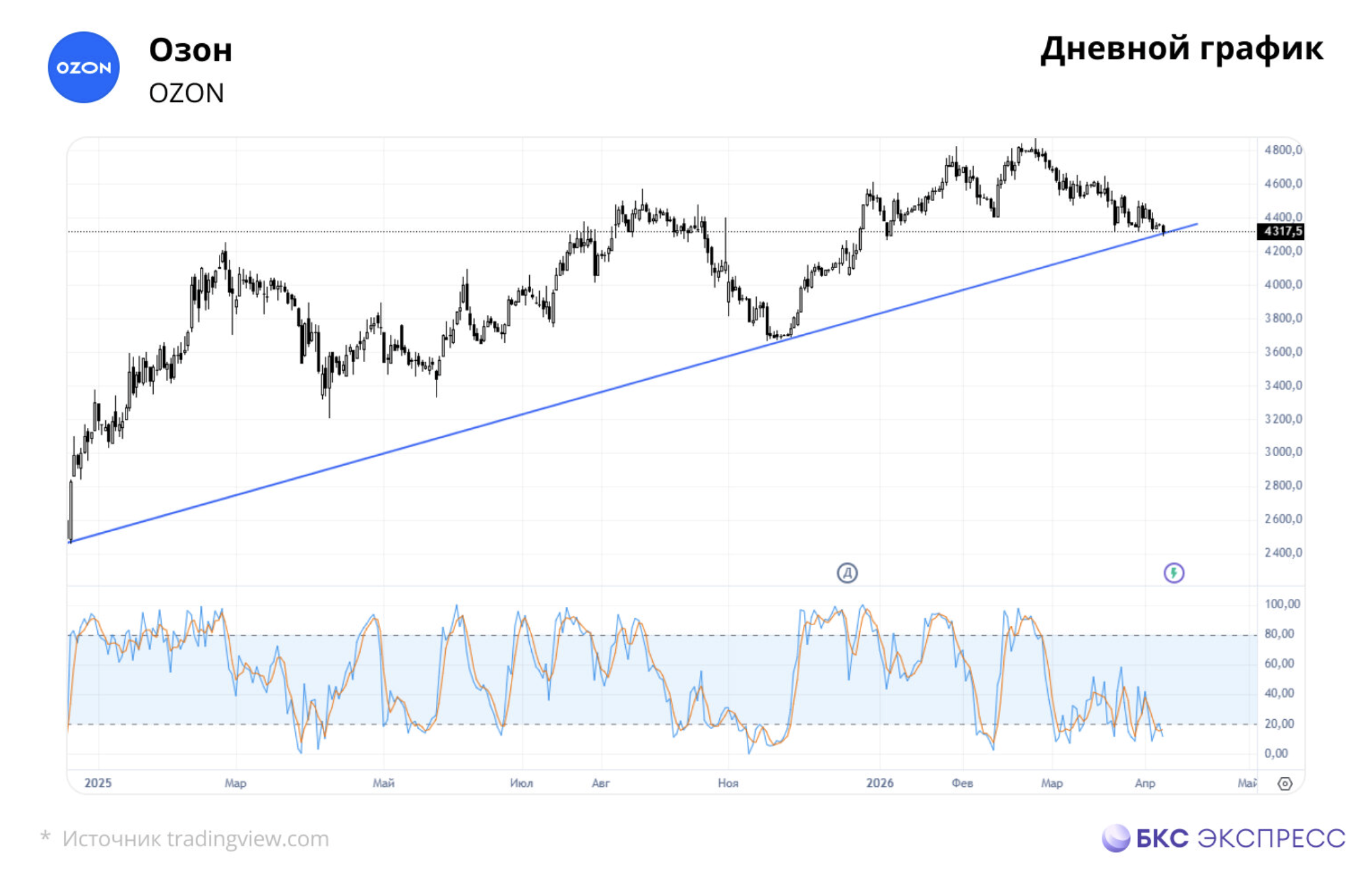 Акции Озона двигаются в восходящем тренде с декабря 2024 г. и сейчас торгуются около последней поддержки тренда. Шансов на успешное преодоление с первого раза мало, учитывая накопившуюся перепроданность в бумагах уже с марта этого года. Кроме того, нынешний тренд устойчиво идет вверх, хоть и не без серьезной волатильности.