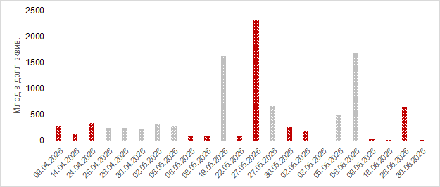 Между тем, объем погашений в секторе во 2К26 весьма значителен и оценивается нами в 4,6 млрд в долларовом эквиваленте. Один Минфин должен погасить «замещающий» выпуск на $2,3 млрд. Кроме погашений ряд эмитентов должны пройти оферты совокупным объемом 5,8 млрд в долларовом эквиваленте.