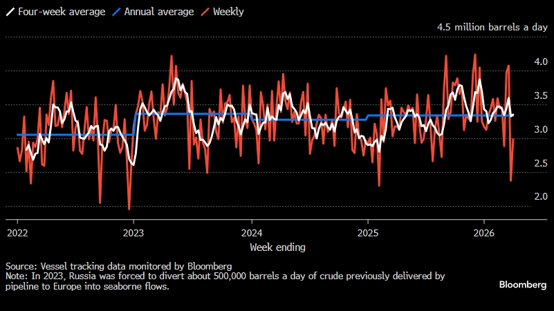 Еженедельные поставки нефти из России восстановили лишь около трети потерь предыдущего периода и оставались ниже 3 миллионов баррелей в сутки вторую неделю подряд за семь дней до 5 апреля. Среднесуточные поставки за четыре недели практически не изменились, увеличившись всего на 20 000 баррелей в сутки и составив в среднем 3,35 миллиона.