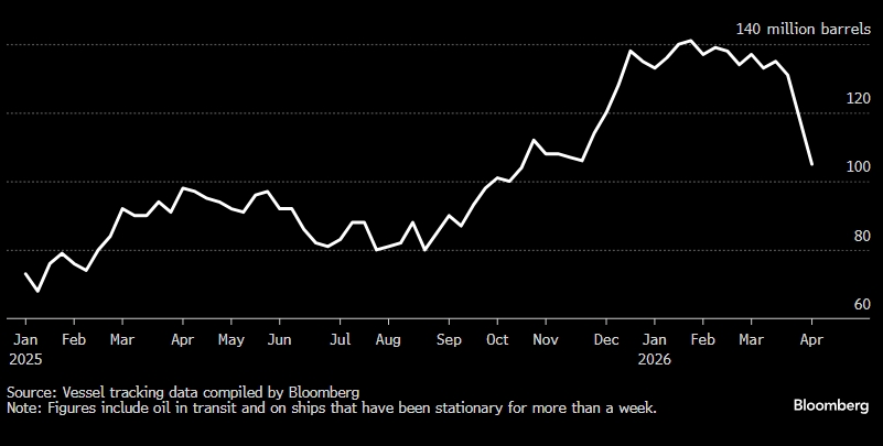 Недавнее падение объемов поставок нефти совпало с резким увеличением поставок с танкеров, ранее застрявших в море с российскими грузами. В результате запасы российской нефти в море быстро истощаются: за две недели до 5 апреля объем нефти на танкерах сократился примерно на 26 миллионов баррелей. К воскресенью объем нефти на воде упал до 105 миллионов баррелей, по сравнению с пиковым значением около 140 миллионов в середине января.