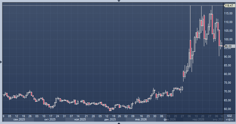 В пятницу цены на нефть марки Brent и West Texas Intermediate находились чуть ниже 100 долларов за баррель. Если цены вырастут на 15–20 долларов, они достигнут пиковых значений кризисного периода, которые наблюдались в середине марта и составляли около 120 долларов за баррель.
