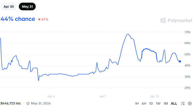 Polymarket: оценка вероятности нормализации судоходства через Ормузский пролив к концу мая (%)