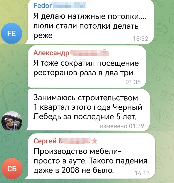 Вот, например, Федор пишет о снижении спроса на натяжные потолки. Александр фиксирует серьёзные проблемы в стройке. А Сергей говорит, что в мебельном бизнесе вообще провальный сезон.