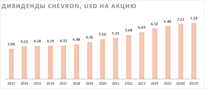 У Chevron достаточно амбициозная стратегия развития. Менеджмент прогнозирует на горизонте 2025–2030 годов среднегодовой рост скорр. свободного денежного потока на 10–14% в год в предположении, что нефть марки Brent будет в диапазоне $60–70 за баррель. Среднегодовой рост добычи углеводородов прогнозируется в диапазоне 2–3%.