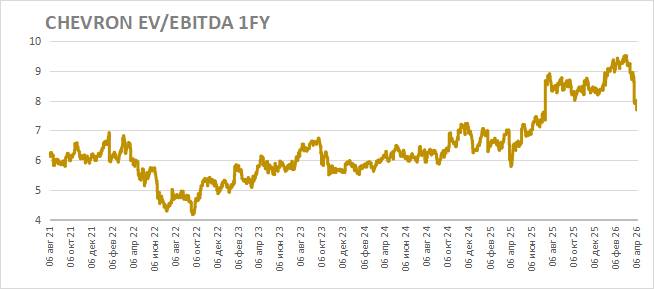 После роста акций оценка Chevron по мультипликаторам выглядит довольно высокой даже с учетом вероятного улучшения финансовых результатов. Текущий форвардный показатель EV/EBITDA 2026E составляет 7,8, хотя в 2021–2024 годах он не поднимался выше 7. Это значит, что даже для оправдания текущей оценки Chevron потребуется более длительный период повышенных цен на нефть.