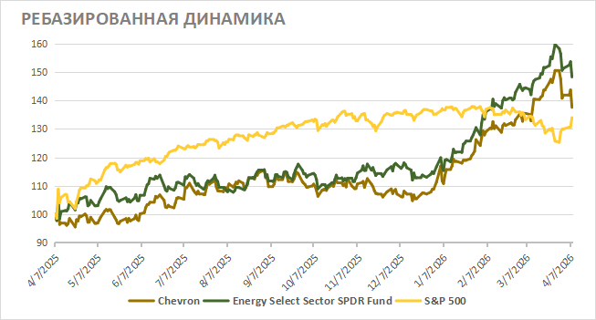 Chevron, как и американский нефтегаз в целом, стал бенефициаром роста цен на нефть из-за конфликта на Ближнем Востоке. У компании небольшой для международного мейджора объем активов на Ближнем Востоке, но Chevron напрямую выигрывает от улучшения конъюнктуры. В то же время с начала года акции Chevron прибавили уже 27% и обновили исторический максимум. На этом фоне прогнозная суммарная доходность дивидендов и байбэка у компании составляет только 7,6%, а форвардный мультипликатор EV/EBITDA поднялся выше исторических значений. Мы считаем, что локально основной потенциал в акциях Chevron уже отыгран.