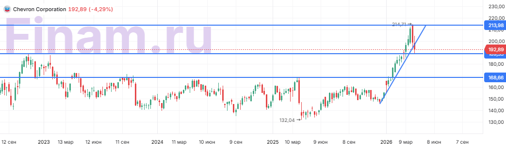 С технической точки зрения на недельном графике акции Chevron не смогли удержаться выше линии восходящего тренда, что уменьшает вероятность дальнейшего роста. Ключевой поддержкой выступает предыдущий исторический максимум у отметки $190. При этом сопротивлением стала граница восходящего тренда.