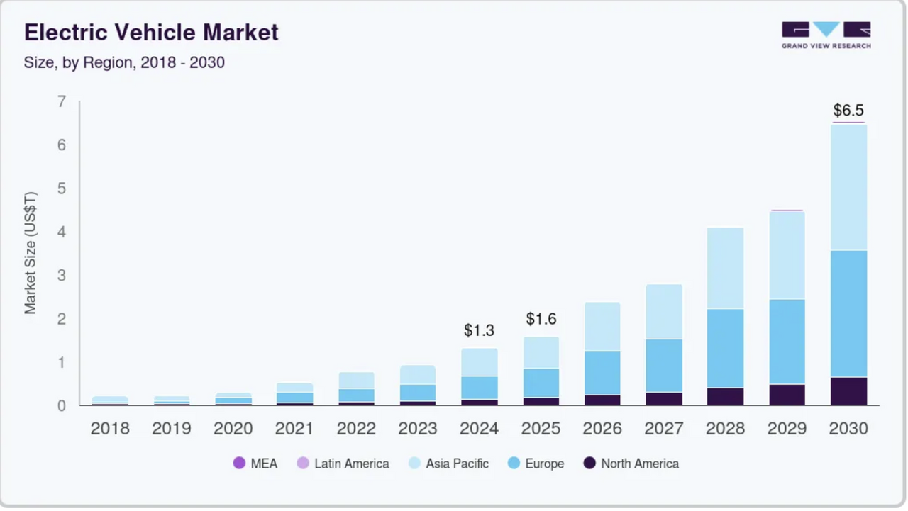 Рынок электромобилей (EV) демонстрирует устойчивый рост и, по прогнозам GrandView Research, достигнет $6 523,97 млрд к 2030 году, увеличиваясь на 32,5% в год, чему способствуют государственная политика, субсидии и инвестиции. Ключевым драйвером выступает Азиатско-Тихоокеанский регион, обеспечивающий почти половину прироста, благодаря активной поддержке инфраструктуры, развитию экосистемы (например, умная зарядка) и масштабированию решений вроде станций замены батарей и электрификации коммерческого транспорта.