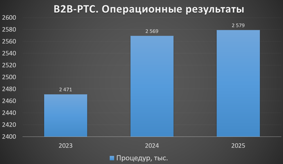 Рост количества процедур в 2025 году фактически остановился. При этом совокупный объем закупок на платформе был в районе 9,7 трлн руб (т.е. около 4,5% объема ВВП РФ).