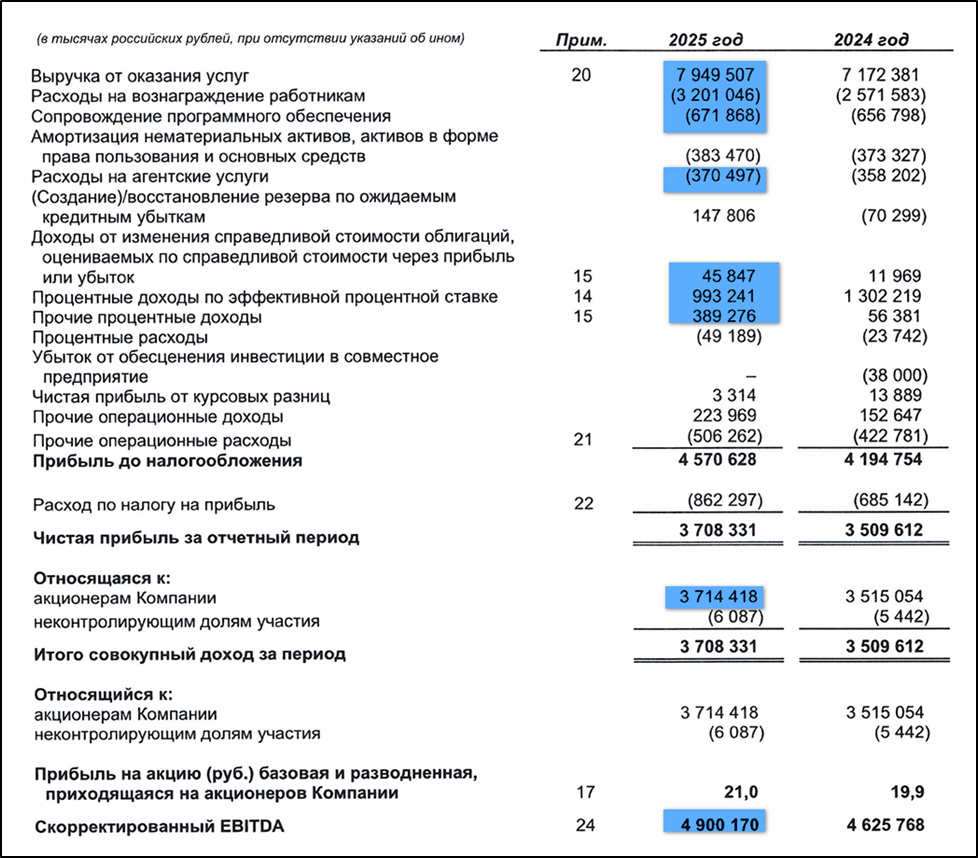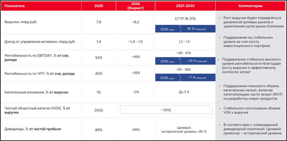 На 2027-2030 год ожидается рост выручки от оказания услуг темпами 18-21%. А выручка от управления активами может даже немного уменьшится из-за снижения ключевой ставки. Рентабельность по EBITDA ≈ 50% и по ЧП ≈ 36%. И целевой уровень выплат дивидендов более 80% от ЧП.