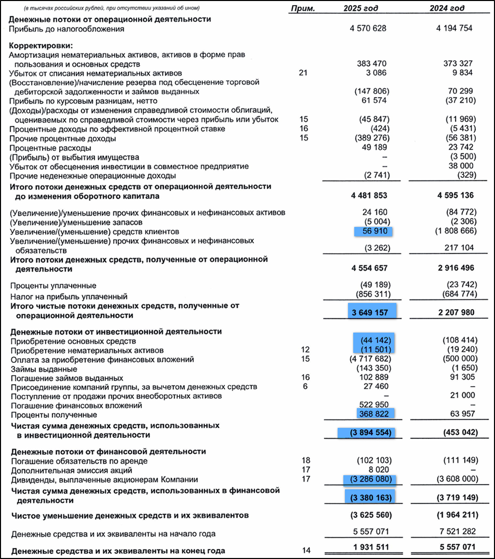 Операционный: +3,6 млрд (+65% г/г). Рост из-за изменений в оборотном капитале (увеличение средств клиентов).