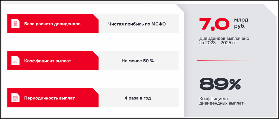 Дивидендная политика предусматривает ежеквартальные выплаты с распределением не менее 50% от ЧП.