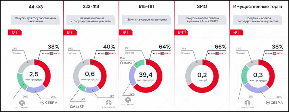 В2В-РТС объединяет в себе первые части названий ключевых активов платформы – B2B-Center и РТС-тендер (не путать с биржей РТС), работающих на целевых рынка коммерческих (b2b) и регулируемых закупок. Платформу используют более 45% государственных заказчиков и 65% крупнейших российских компаний – отраслевых лидеров.