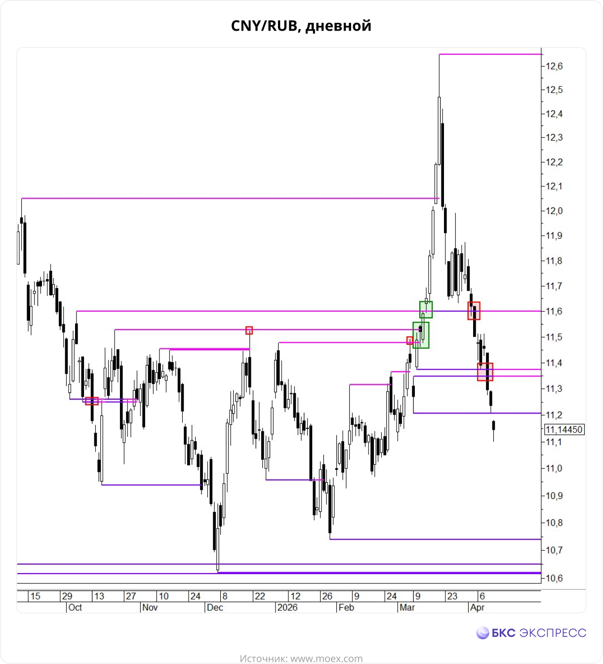Поэтому курс рубля может сохранять восходящую динамику. Юань с ходу пробил поддержку 11,2 руб. — возможность проверки на прочность мы отмечали еще в начале прошлой недели. Пока паре CNY/RUB удалось удержаться от ускорения снижения. Однако в случае обновления установленного сегодня немного ниже 11,1 руб. двухмесячного минимума увеличится вероятность движения к следующей поддержке — психологически важному уровню 11 руб.