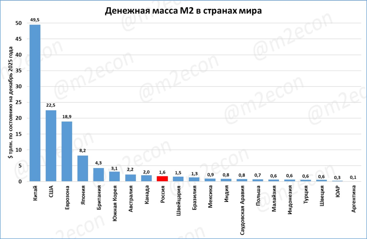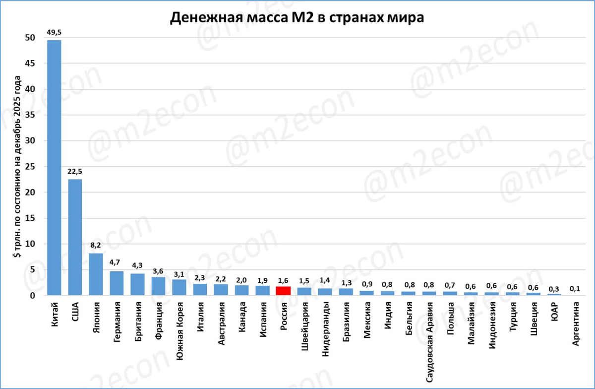 Рейтинг стран по денежной массе: Россия на 12-м месте в мире ($1,6 трлн). Лидируют Китай (49,5), США (22,5), Еврозона (18,9), Япония (8,2).