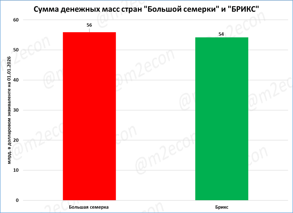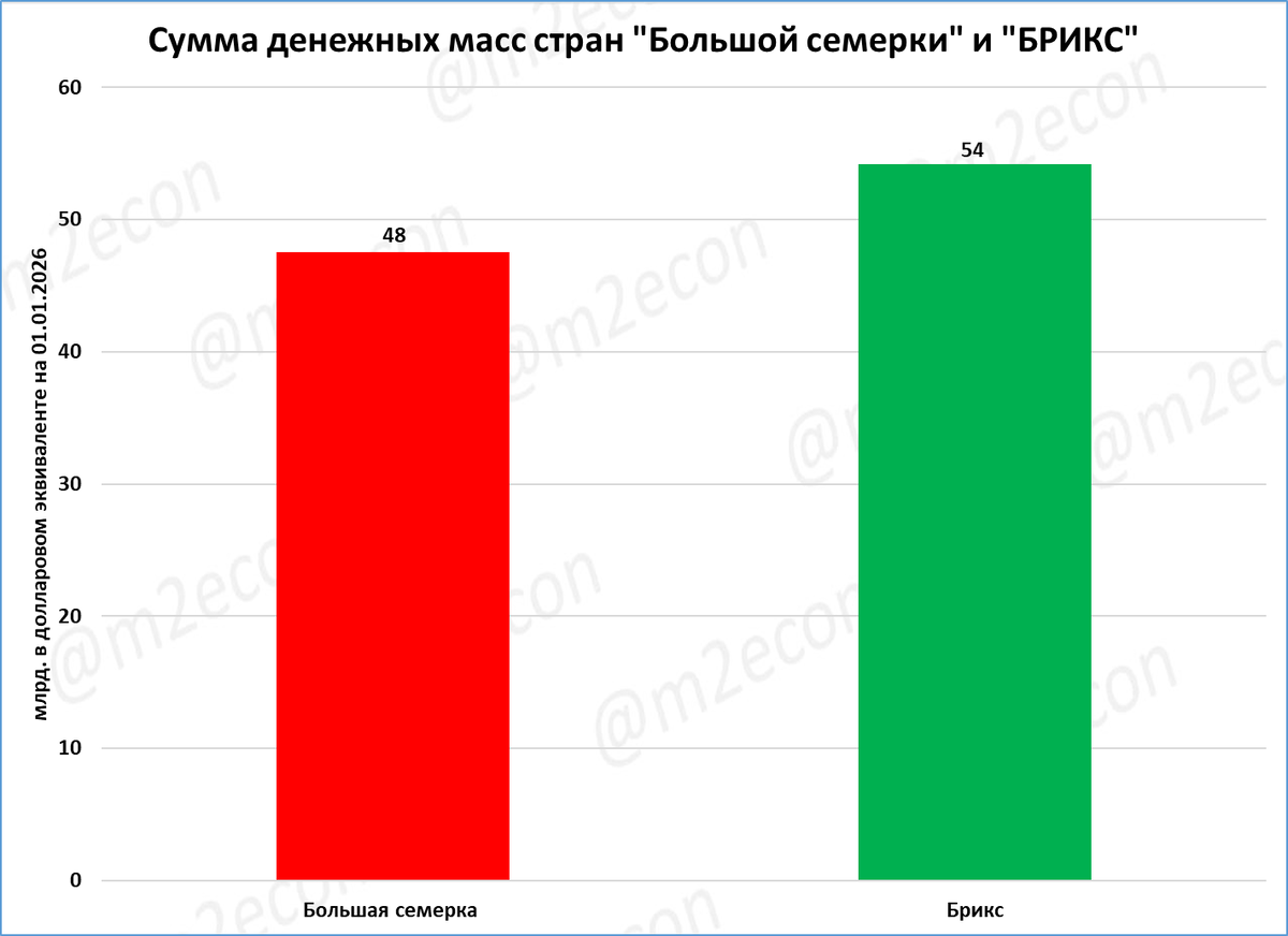 БРИКС (54 трлн в долларовом эквиваленте) опережает страны Большой семёрки (48 трлн) по объёму денежной массы*.