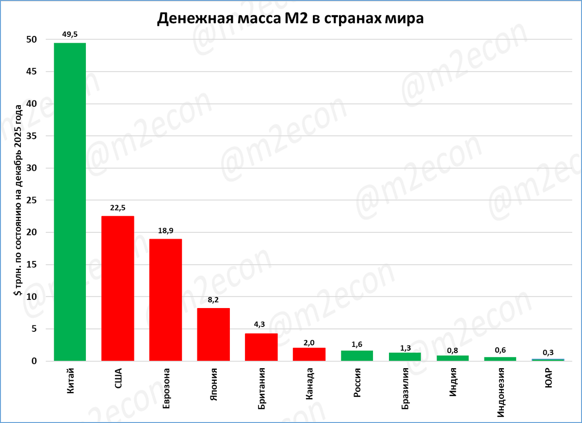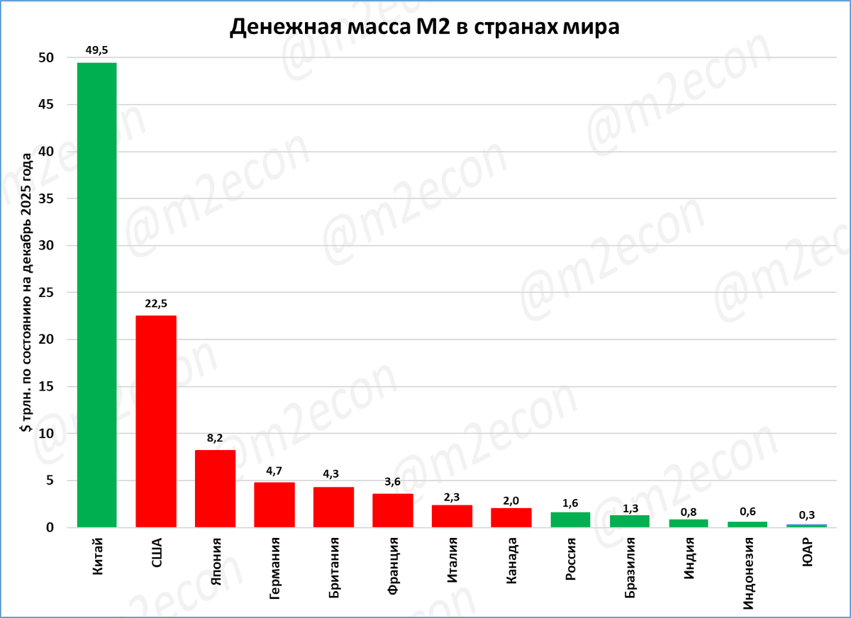Рейтинг стран по денежной массе на конец 2025 года приведён на графике ниже. Лидирует Китай, на втором месте США, на третьем Япония.