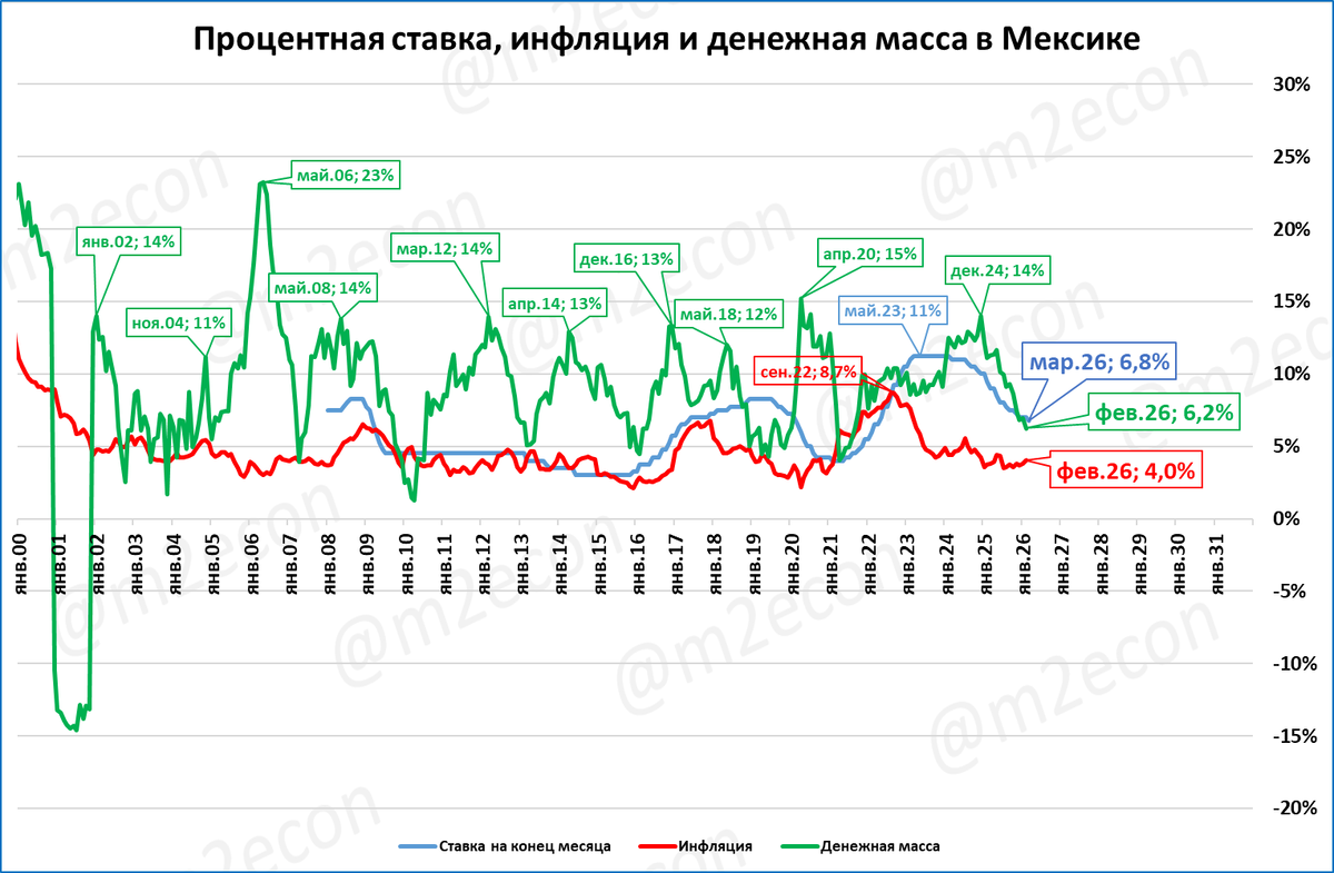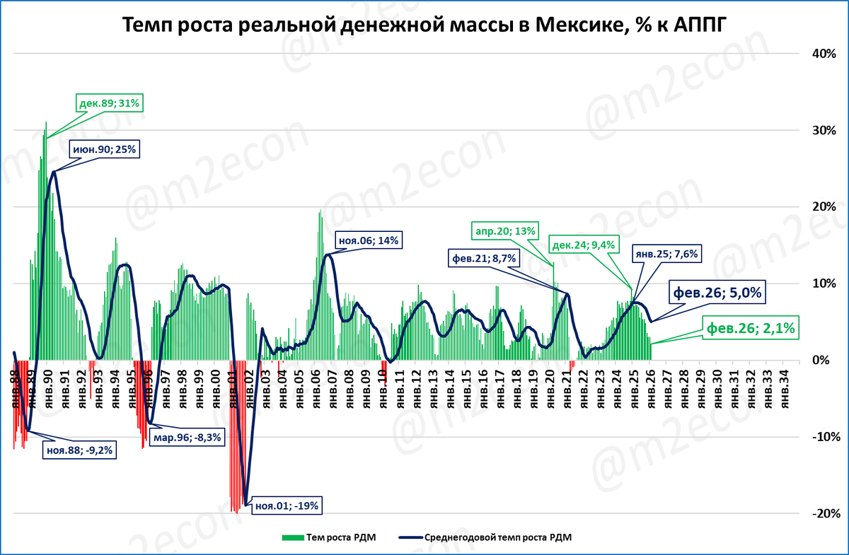 В Мексике рост РДМ замедлился с 3,0% годовых в январе до 2,1% годовых в феврале 2026. ВВП в 4 квартале вырос на 1,8%, рост за 2025 год +0,6%.