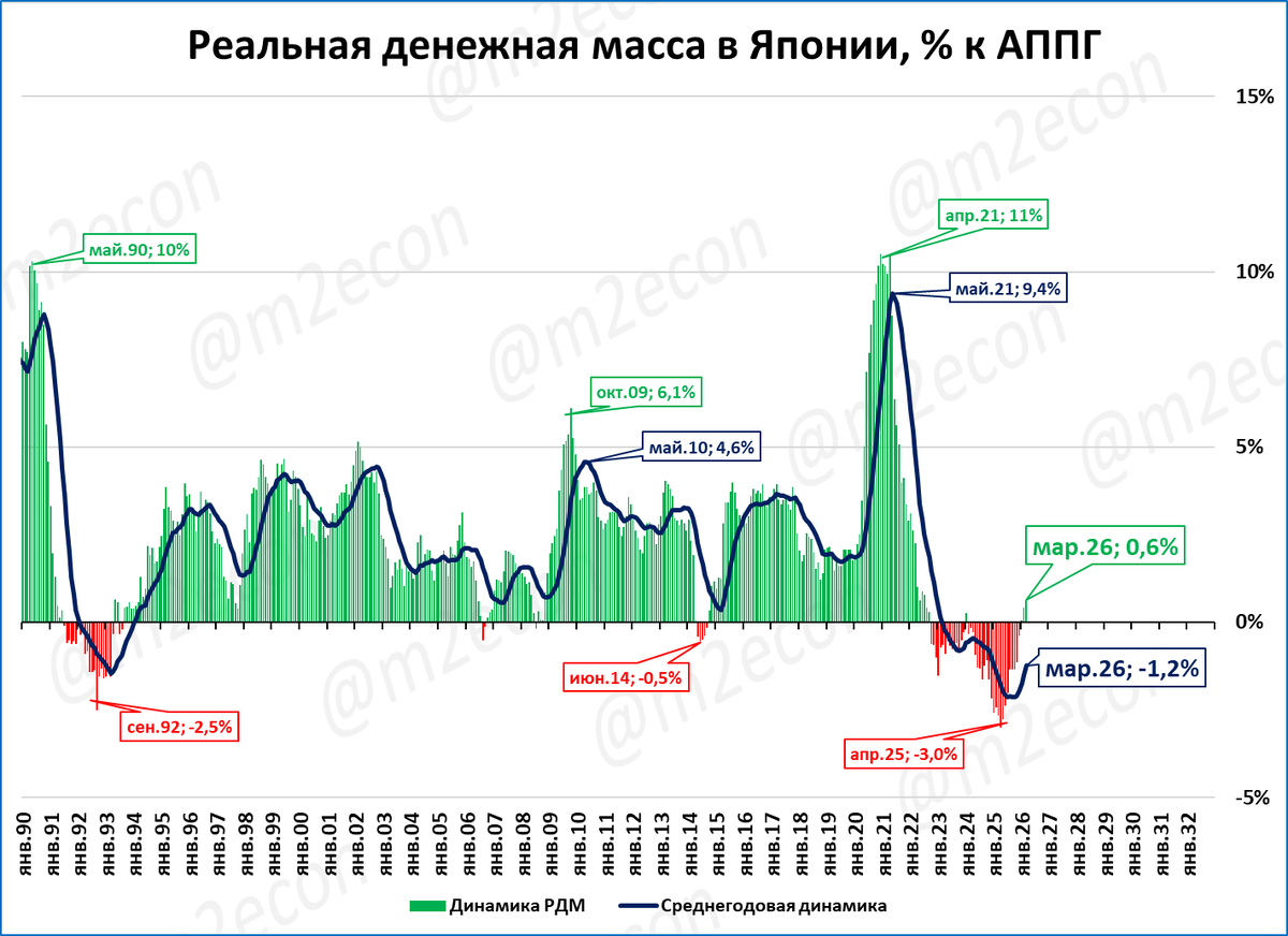 Рост РДМ в Японии по итогам марта составил 0,6%. Падение, продолжавшееся практически с 2022 года, завершилось. ВВП в 4 квартале вырос на 0,4% годовых.