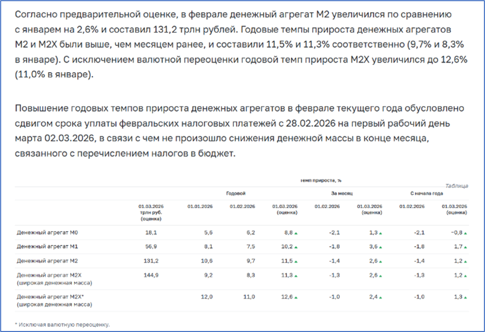 Рост реальной денежной массы в феврале составил 2,1% к февралю 2025 года.