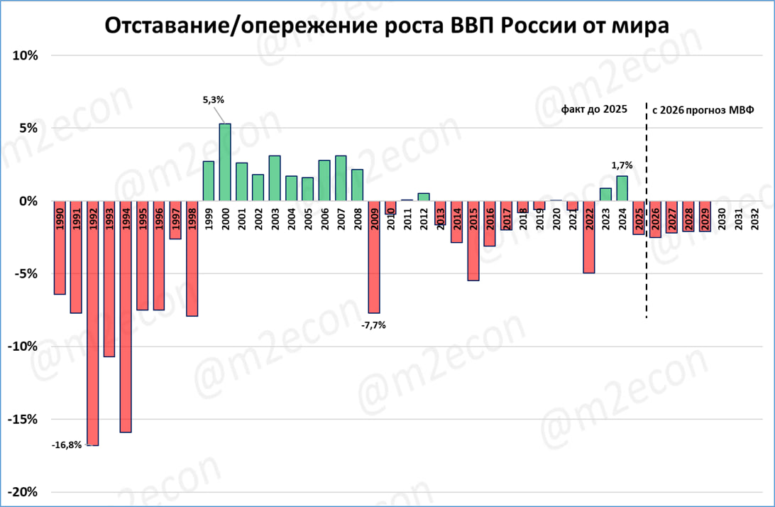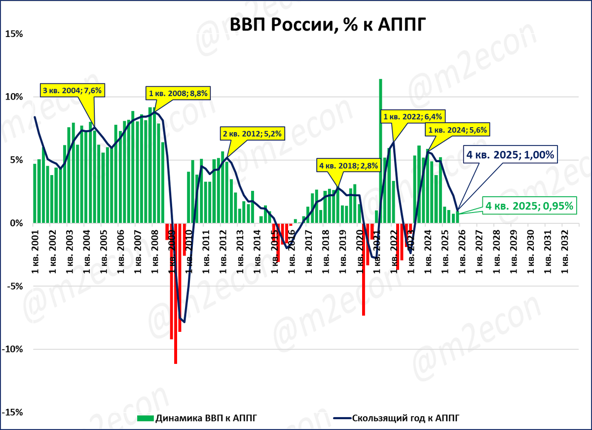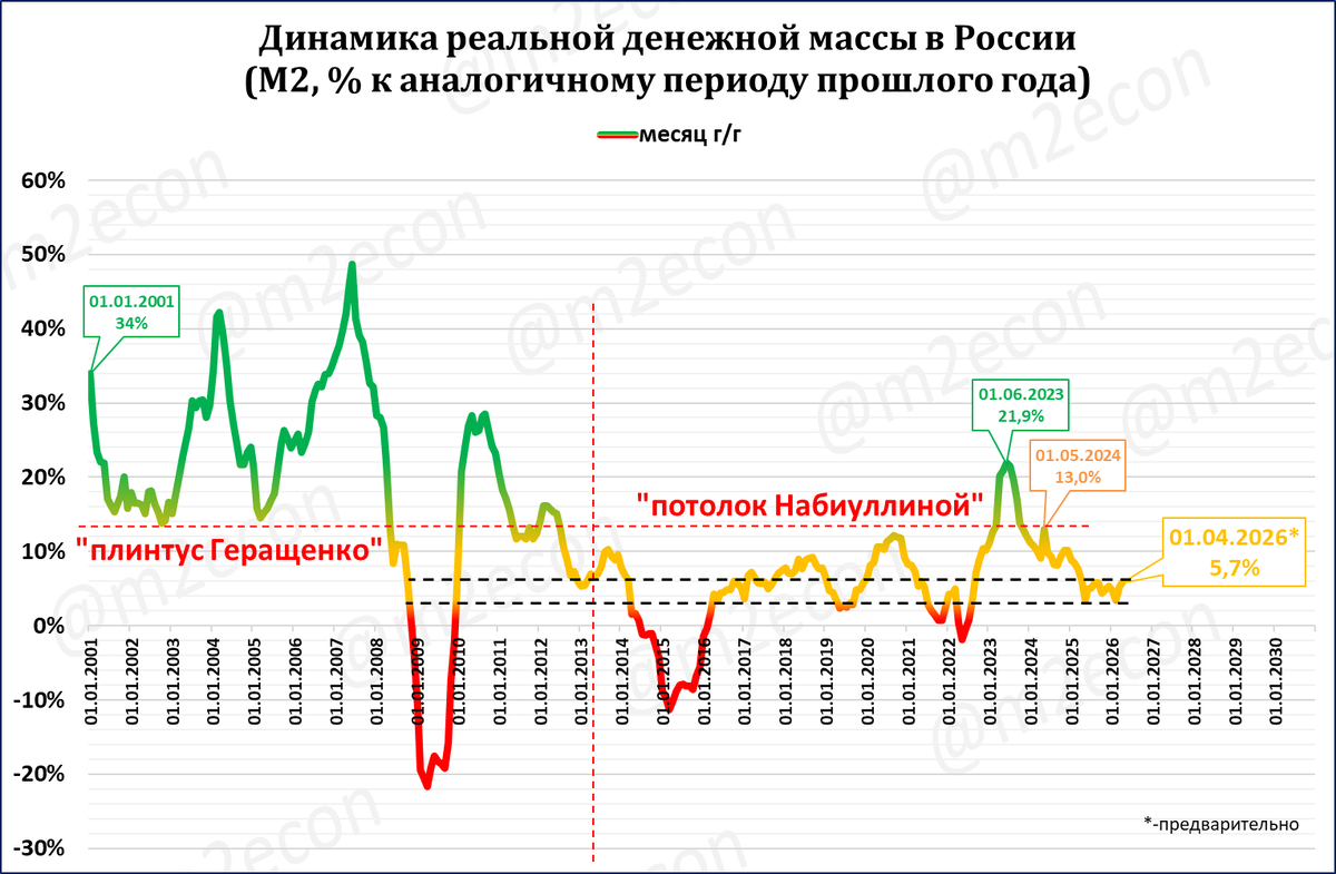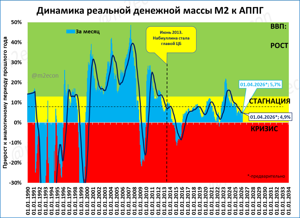 Угроза падения ВВП в 2026 году выглядит реальной. Самое обидное, что происходит это не из-за внешних воздействий, а из-за зажима реальной денежной массы Центробанком (см. предыдущие сюжеты).