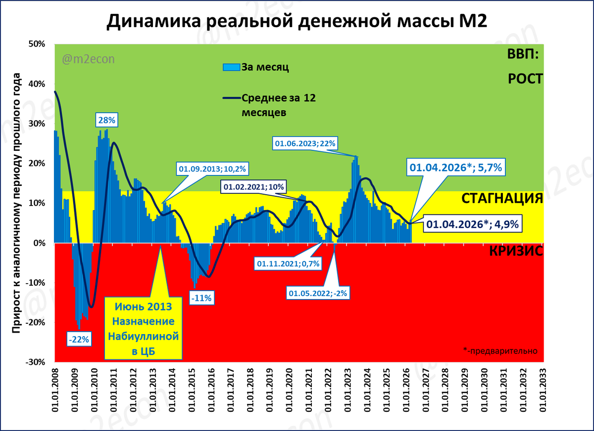 Резюме: Набиуллина продолжает держать темпы роста реальной денежной массы в стагнационной (жёлтой) зоне.