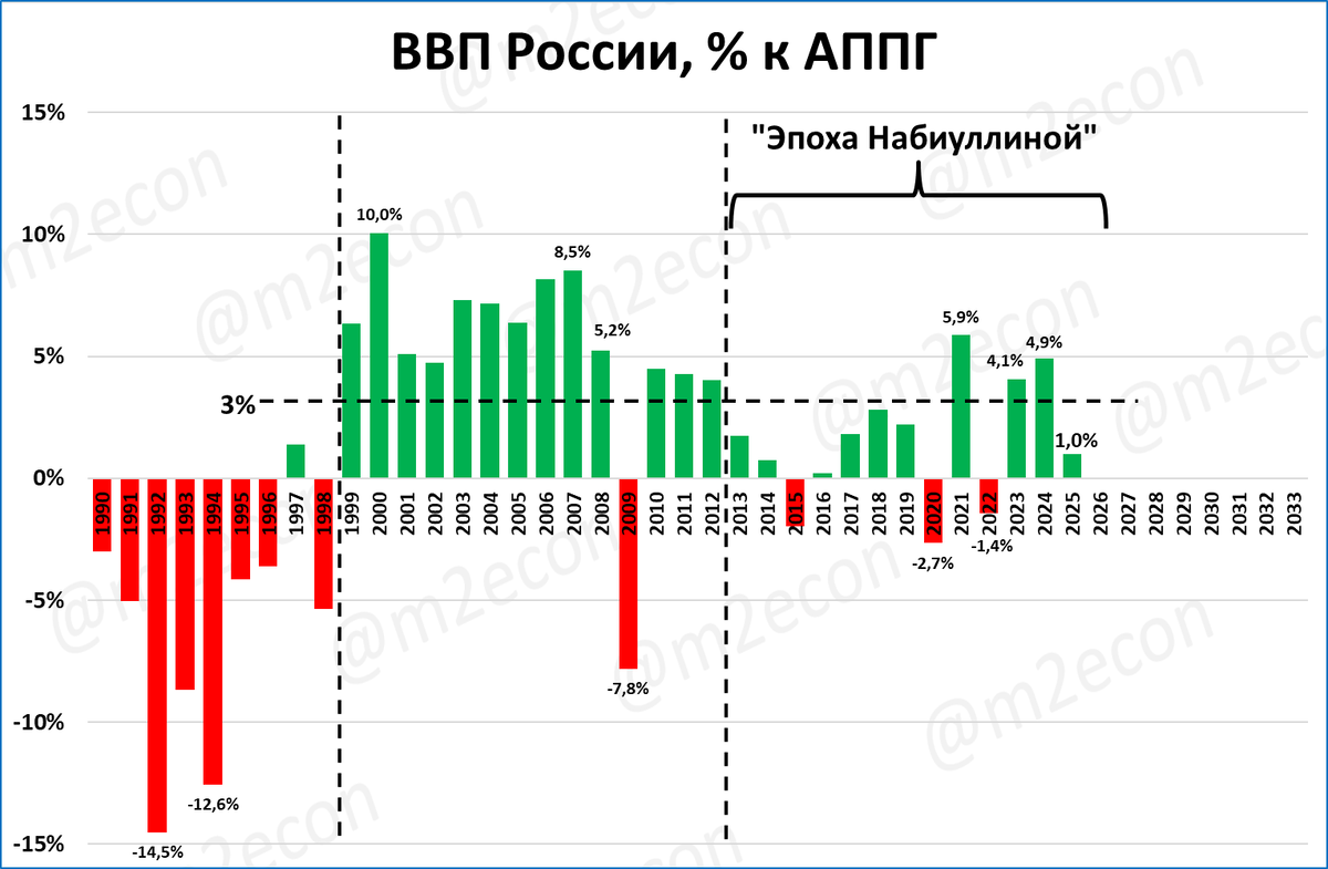 2013-2025: Эпоха Набиуллиной. ВВП по чти всё время имел динамику -2,7...+2,8%. Исключениями стали 2021 (+5,9%), 2023 (+4,1%) и 2024 (+4,9%) годы.