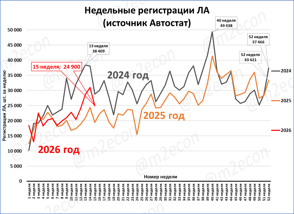 По данным агентства «Автостат», регистрации легковых автомобилей на 15 неделе составили 24,9 тыс. шт.