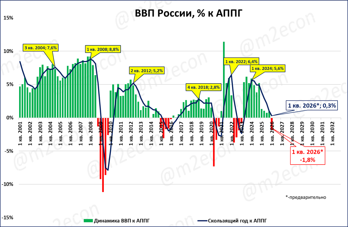 ВВП в 1 кв. 2026 года: -1,8% (предварительно).