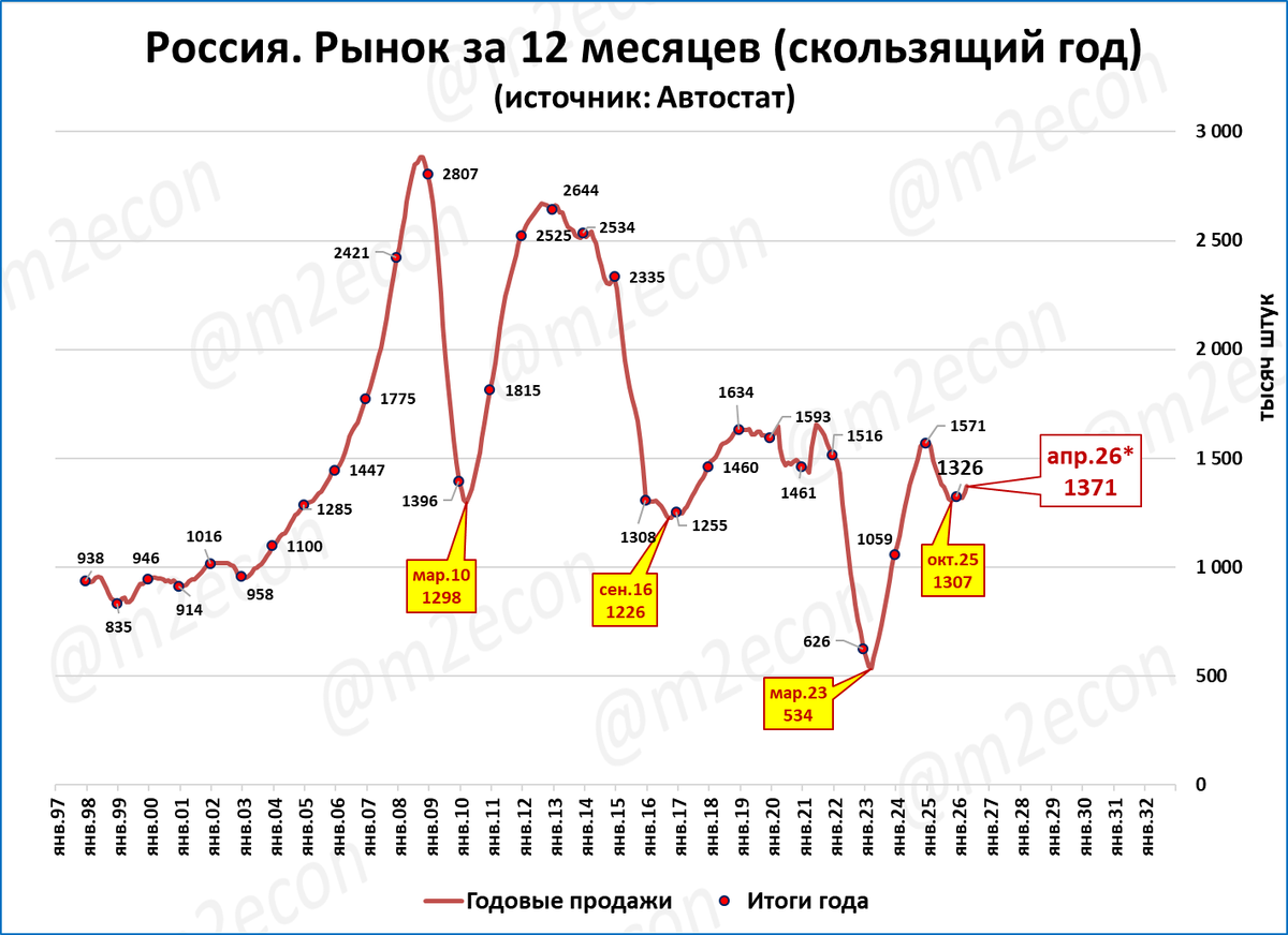 По итогам апреля 12-месячные продажи (за скользящий год) составят 1,37 млн., если оценка апреля верна